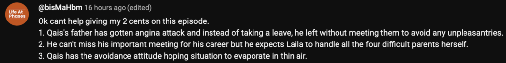 And then there was Qais, gone before any of it unfolded. He left early for an important meeting, missing the confrontation entirely. His absence was not neglect, but a kind of privilege that allows men to step away from domestic conflict under the banner of responsibility. He gets to prioritise work without question, a freedom his wife is not afforded. When Laila tried to reschedule her interview to keep the peace, it was not weakness but weary diplomacy.