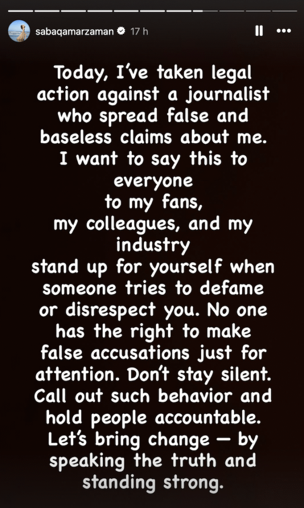The Kamli and Pamaal star shared the legal notice on her Instagram story, demanding that Hanif remove the content, issue a public apology, and refrain from spreading misinformation. Her legal team has given him seven days to comply or face court proceedings.