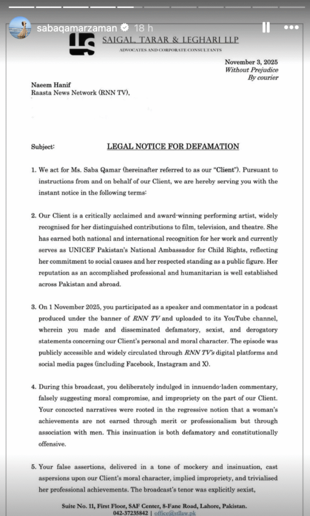 Saba Qamar has issued a legal notice to journalist Naeem Hanif, warning of a Rs 100 million defamation lawsuit over what she calls “false and baseless allegations” made about her personal life in a recent YouTube interview.
