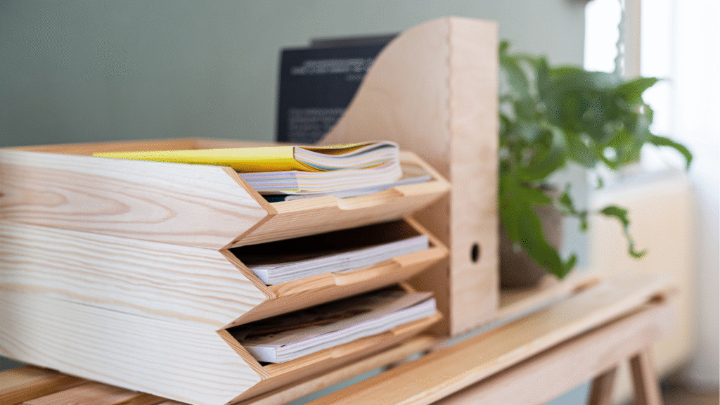 Clutter does not just take up space, it takes up focus. Keep what you actually need on your desk and give everything else a home. A small basket, box or tray can hide the mess while keeping things tidy. The goal is not perfection, it is peace of mind.
